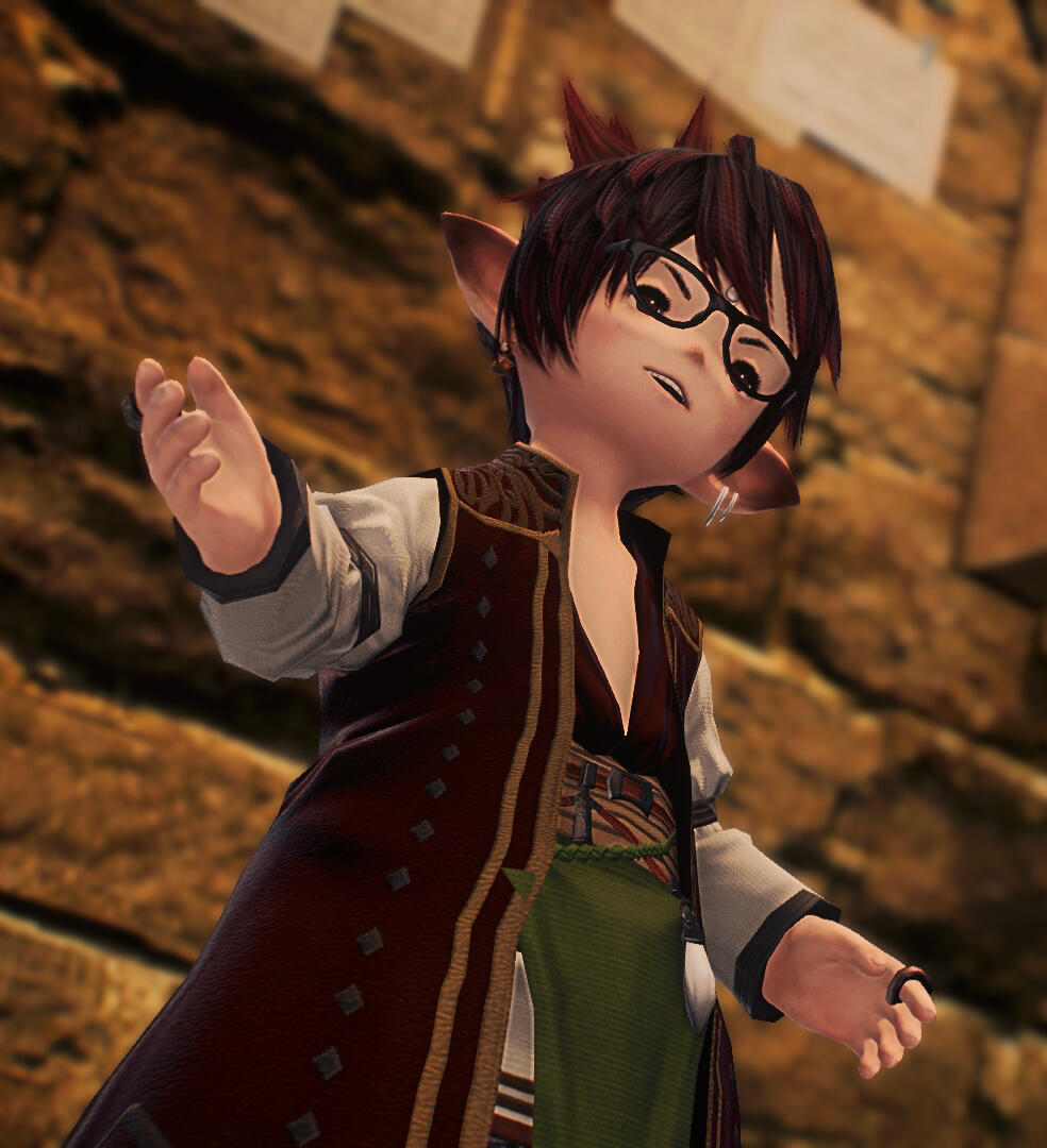 I was born in Ul’dah, my mother, Nonoko Noko, of the Dunesfolk and to my father, Gijo Famejo, of course of the Plainsfolk. I have two siblings, my younger brother, Bababora Tatabora and my younger sister, Latoto Loto. My father is a former member of the Syndicate and as such we were afforded a comfortable lifestyle in the midst of heavy class division.